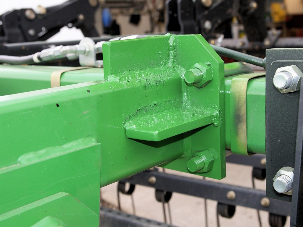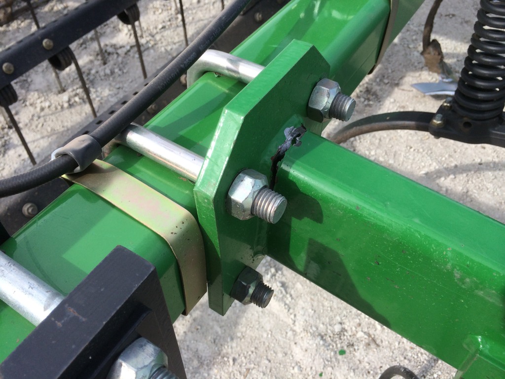 ![]() Chebanse, IL..... | We have a JD 2310 soil finisher that's a couple years old. A few days ago we discovered a bracket broken from it's tubing. This bracket was completely severed, and only the 2nd ( of two) bracket on that far RH section was carrying the drag & basket. It was pulled away & wasn't going to last much longer. If it had broken, the whole section would've departed from the soil finisher frame. Our 2310 has the JD factory optioned rolling basket & coil tine harrow. Nothing was added or modified by us. Also no previous damage to this unit. As you can see in photo #2, the weld did not break, the metal below the weld completely tore out of the tube. We did have to weld the bracket back on to that tube. Then we added gussets to distribute some of the weld load back further on the tube. No engineering work there...we just thought it looked like it needed that. Then, we examined the outer section on the LH end of the finisher. We could see some "blistered" paint indicating that there was some stress to the weld there also. So, we cut gussets & had them welded on the tubes to prevent an in-field breakage, or worse yet, potentially preventing losing the drag on the highway with traffic following. I'd recommend to other JD 2310 owner/operators to examine the weld areas on those brackets & consider your own preventive measures like addng gussets. Again, the welds are not breaking, the metal behind the welds is pulling apart. The center sections don't seem to have that problem, perhaps due to the fact that they have larger tubing frames, thereby giving more surface to support the bracket weldment. Perhaps photos will help. Note that on the initial repair, no time was taken to repaint welded areas. Today they got painted.
