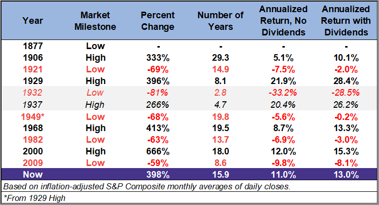 Note that this commentary focuses on price rather than total return. For a perspective on total returns across this timeline, see our periodically updated Total Return Roller Coaster.