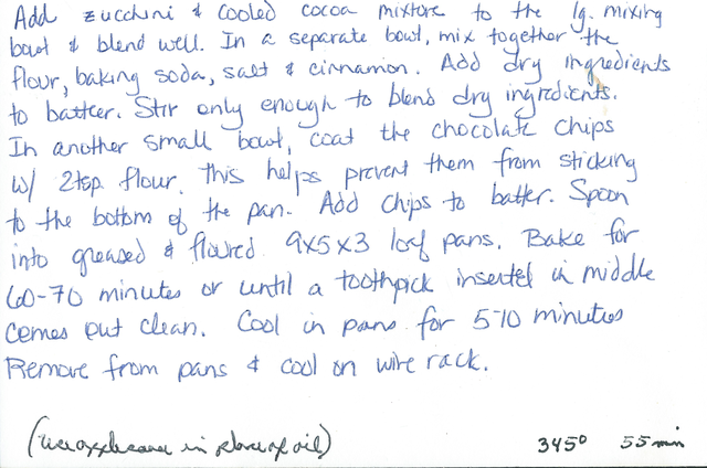 Zucchini Nut Bread and Zucchini Beef Skillet. Both delicious and easy to make. Can also add cocoa powder and chocolate chips to make a chocolate version of the bread. Very good moist. Good warm or after being refrigerated and freezes well. Recipes scanned and attached below. EDIT: Looks like I had the chocolate version uploaded before also mentions using applesauce in place of the oil.