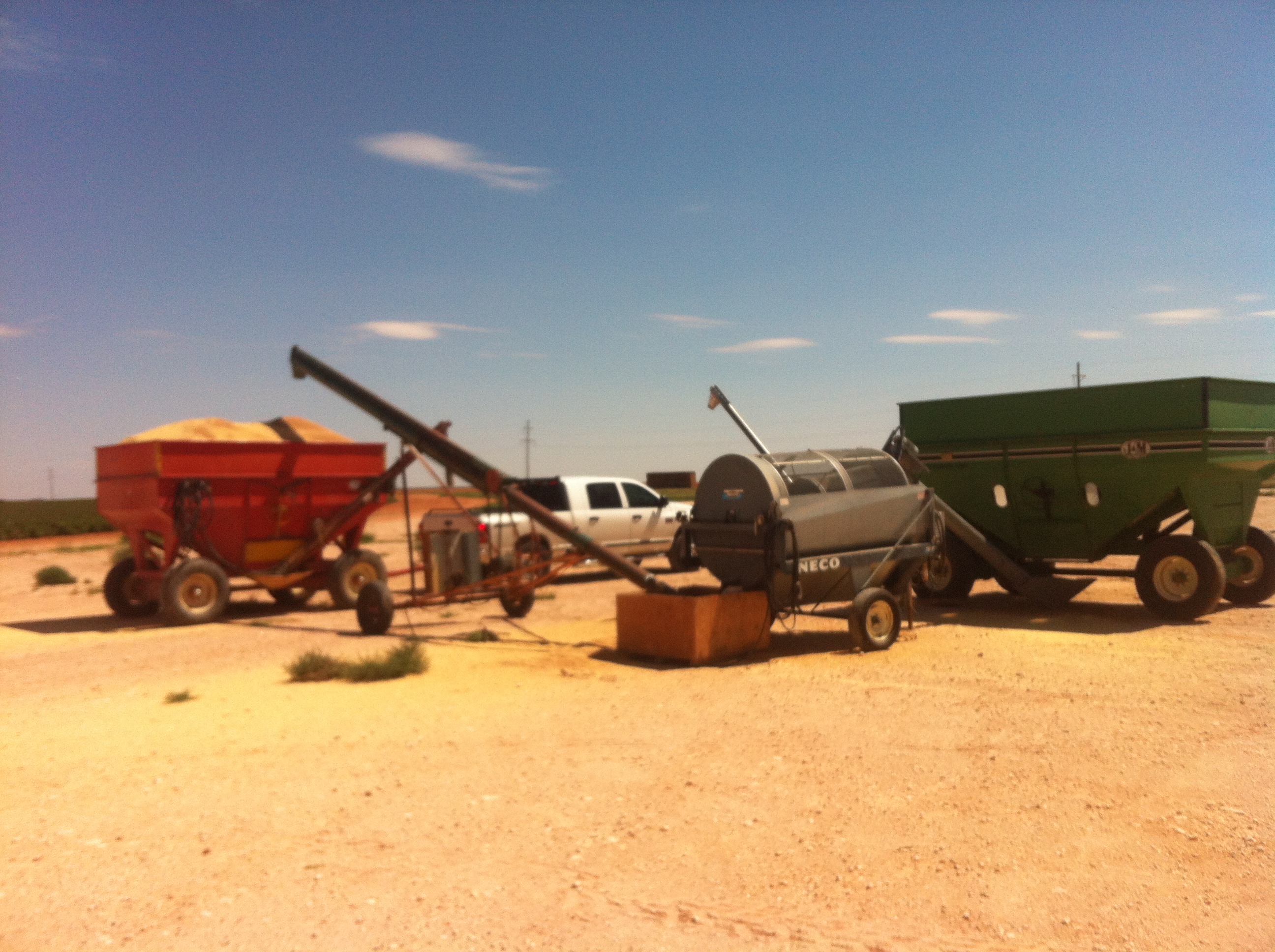 It really needs a fan to blow the light stuff out that the drum doesn't get. Rigging up a peanut conveyor belt that had a trash fan at one time. We dug it out of the weeds and are putting it back on so we can use it on this wheat.