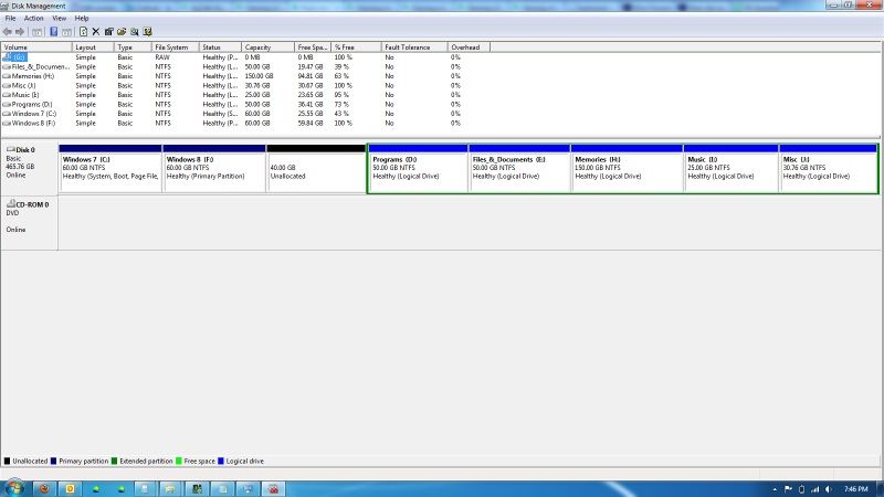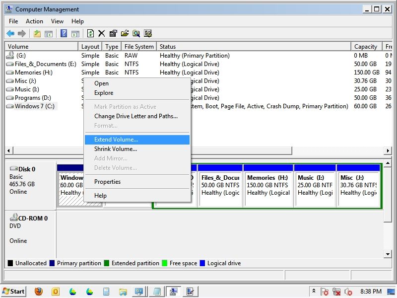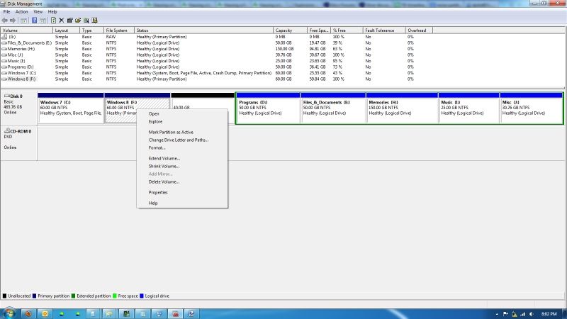 You can see there is a list of volumes. The first one that shows up on my list is my DVD drive and the rest of the ones in the list are partitions on my hard drive. Below that you can see a graphical representation of how each drive is divided. You can see that my hard drive has two partitions that are dark blue/purple, an unallocated black area, and then 5 blue partitions that are all grouped together by being outlined in green. The dark blue/purple partitions are primary partitions. You will have either two or three of these. I would imagine you'll have three, one of which will be the 100 MB partition that Windows created when you installed. My five partitions that are outlined in green are different than anything you will likely ever use so I'm going to ignore them. We will instead focus on my Windows 7 and Windows 8 partitions. I do not have Windows 8 yet so I am going to remove the Windows 8 partition, then I'm going to enlarge the Windows 7 partition so it fills in the space that was left by the Windows 8 partition. Since I have unallocated space behind the Windows 8 partition (that I reserved for my Linux installation at a later date) I will be able to expand my Windows 7 partition to be 160 GB (60 for the original partition, 60 for Windows 8 partition and 40 of unallocated will all be Windows 7). 2. Make sure that you have moved all the data off of your large D: partition and in to the smaller C: partition. 3. Delete the D: partition. The way I did this was by right clicking on the graphical representation of my Windows 8 partition. See the image below: