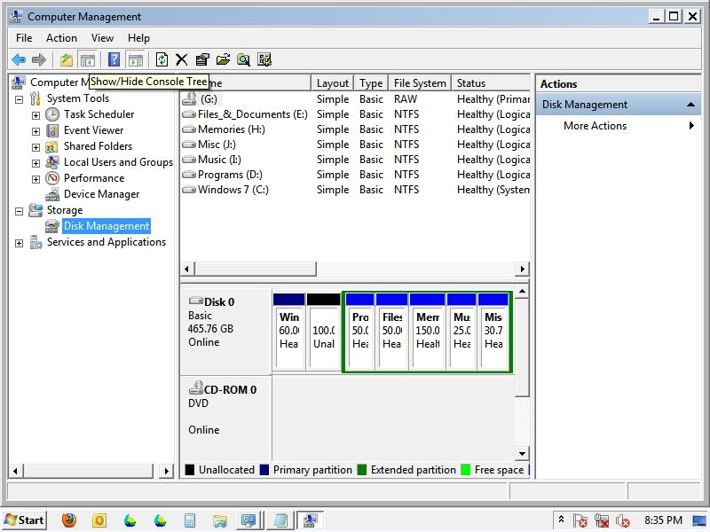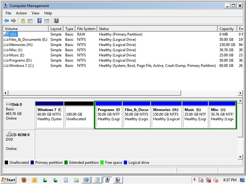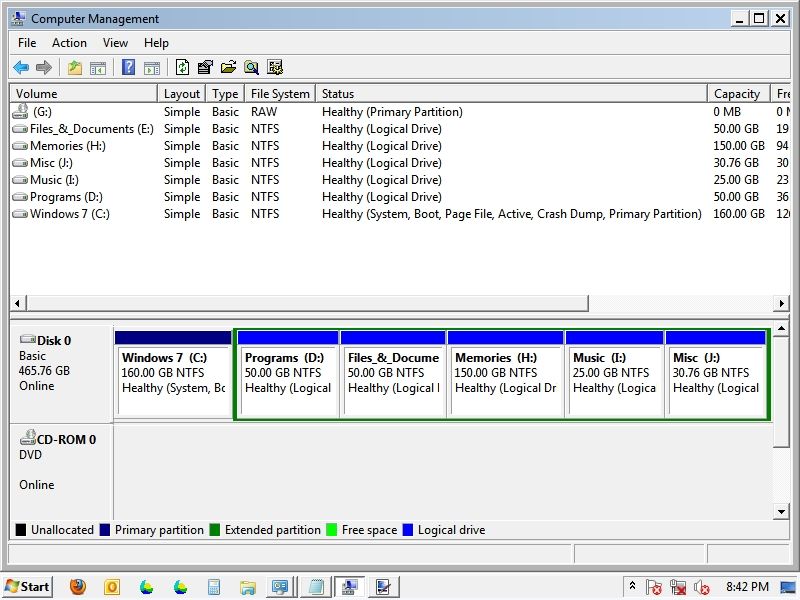 Then I clicked "Delete Volume". Absolutely do not do this until everything that's on the partition is backed up or transferred to the C partition or something. This is where I had problems. It said are you sure you want to delete and I said yes. Then it said the volume is in use and asked if I wanted to force it to delete. I don't like forcing anything on a computer so I said no. I restarted the computer and tried again. It still didn't work. So I restarted and booted in to safe mode. Don't boot in to safe mode unless you get the error that I got. I searched on the internet and it appears that a lot of the time one does not get that error. But if you do, go ahead and restart your computer and then start tapping the F8 key a little bit faster than 1 time per second until the computer gives you the option to boot in to safe mode. If you need to boot in to safe mode, keep reading. If you don't, skip down a ways. 4. So now you've booted in to safe mode. It looks old school right? Go to Start > Control Panel > Administrative Tools > Computer Management. Single click on "Disk Management" now. 5. Since you don't have video drivers loaded in safe mode, there isn't much screen real estate and Disk management looks different in safe mode. See below: