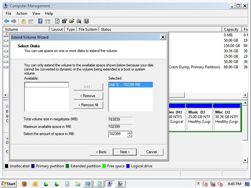 As you can see, for me the wizard defaulted to where it was going to extend my partition by 102,399 MB as shown in the "Selected" box. Hopefully yours will show way more than that and all you'll have to do is click next. That's what I did. When I clicked next I got what you see below:
