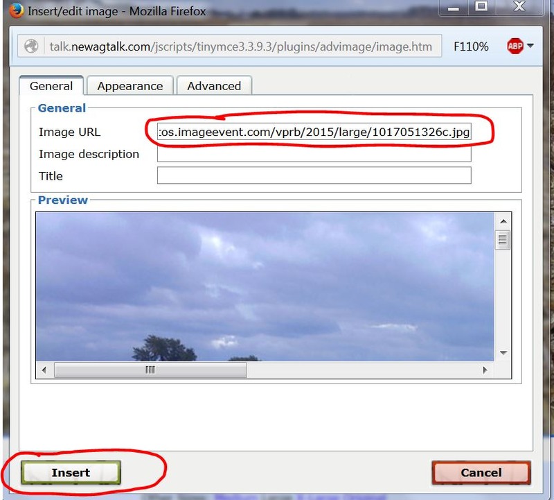 The pop up window opens and you paste the address in the image URL line and hit insert.