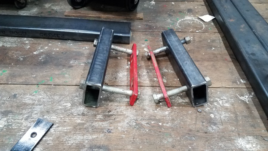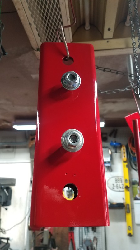 http://www.stengelbros.com/u-bolts/ Then I got things set up at the drill press and began drilling holes for the 2 U-bolts for each tube plus the mounting holes for the J&M cradle for the auger mate. I measured carefully and drilled the holes from both sides of the tubing and they all lined up just fine.   Next I cut a couple shorter pieces of tube to serve as spacers to get the cradle away from the wood runner to provide clearance for the auger mate unit. I had a couple heavy strap pieces with multiple holes off an old Kasco plow drag that got re-purposed for the other 1/2 of these short sections of tube to clamp to the runners.  I drilled holes in the short pieces of tube to match the J&M cradle and ended up using short bolts inserted from the inside of the tube protruding out to bolt the J&M cradle on.