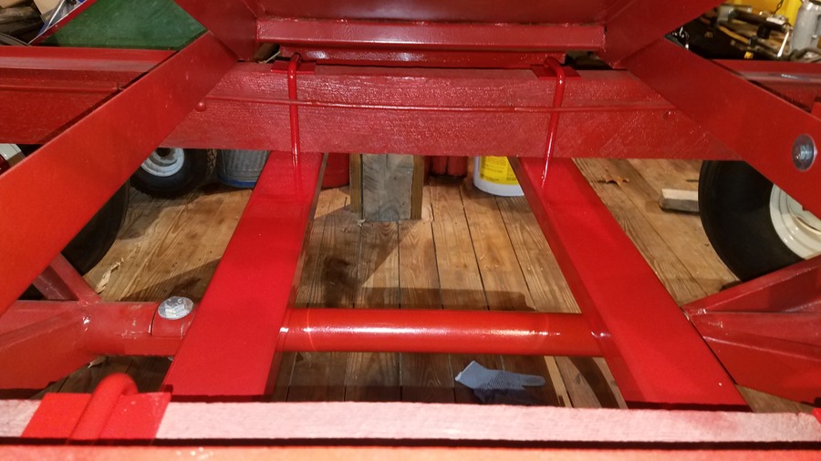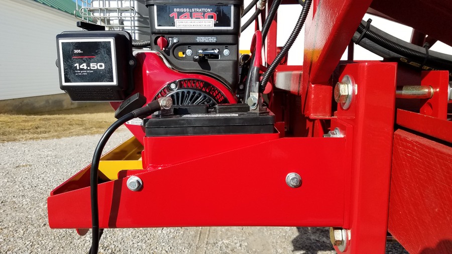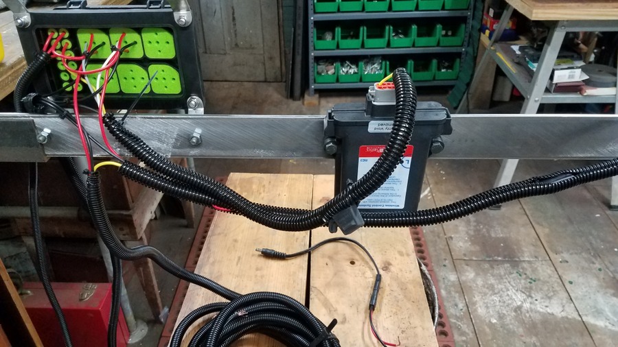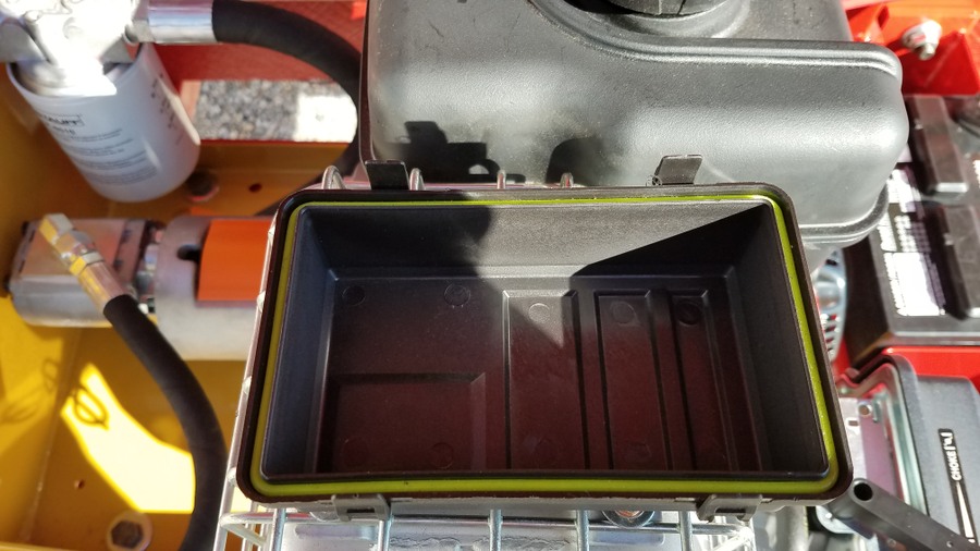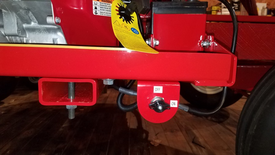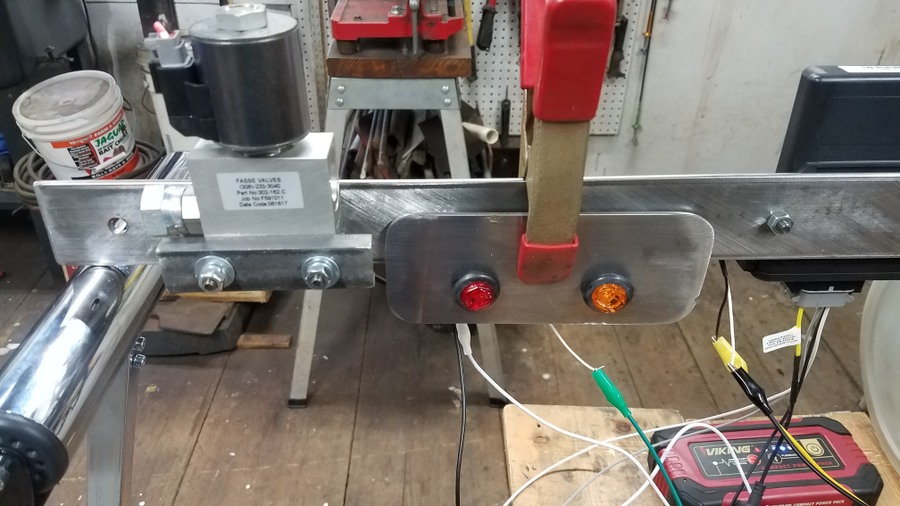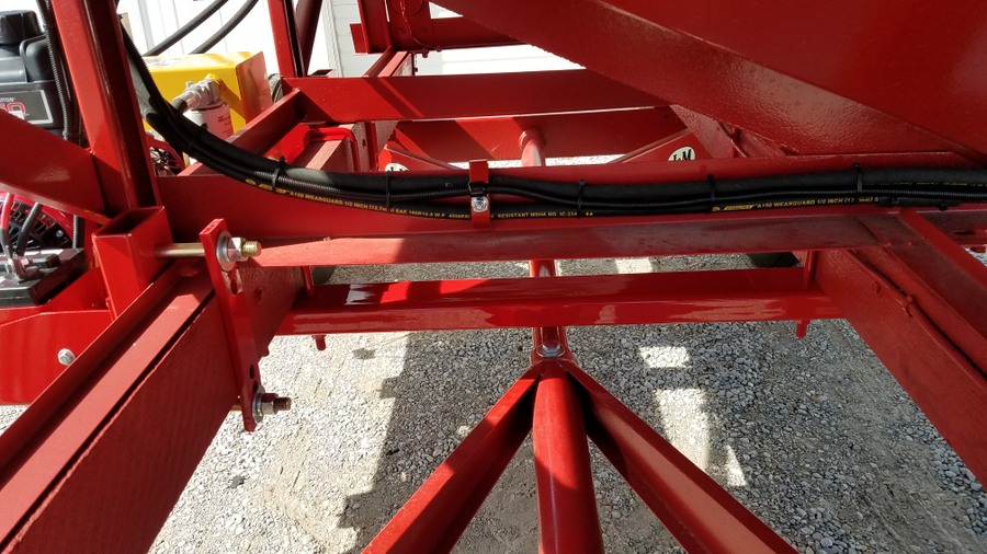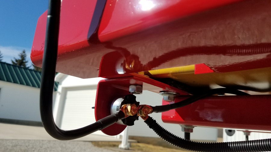 Painted tubing slid into place and secured with U bolts and plates  Wiring on the backside of the mounting bar that holds the relay/fuse box, remote control, and solenoid valve. Plenty of wire loom & clamps keep things protected and held in place.   Battery box and disconnect switch were connected with battery cables I made using the hydraulic crimping tool I posted about here. https://talk.newagtalk.com/forums/thread-view.asp?tid=680568  So here is everything completed. I'm happy to report everything works as planned and there were no hydraulic leaks. Here are the rectangular tubes under the wood runners.    Here are the short pieces of tube that space the J&M cradle away from the side of the wood runner for engine clearance.     The battery and system disconnect to prevent the remote control from draining the battery or any shorts when being stored.  The Fasse hydraulic solenoid valve  Inside the relay/fuse box  The gasketed lid for the relay/fuse box  Fasse Valve, Lundell remote control, and relay/fuse box on the mounting bar above the augermate.  LED indicator panel