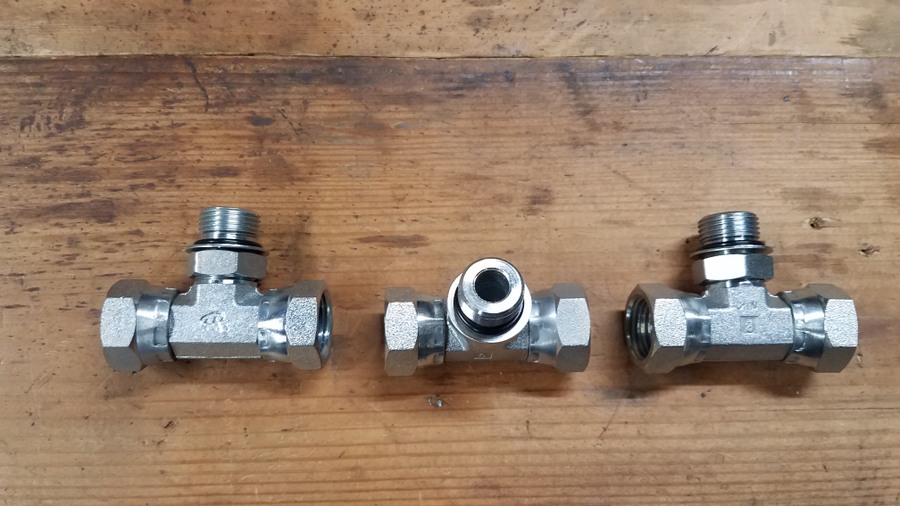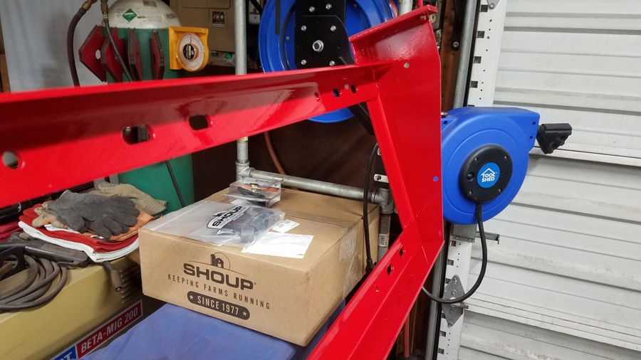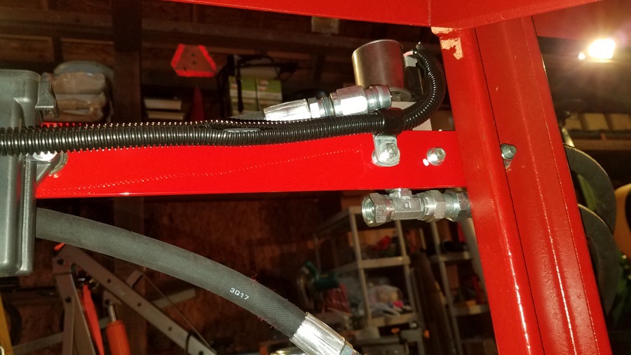 Next came the search for the unobtanium hydraulic fitting for the solenoid valve. https://talk.newagtalk.com/forums/thread-view.asp?tid=837591  I had used 2 sets of 1/2" hydraulic hoses on the original build. One set went from the auger to a pass through plate that bolted to the wagon and the other set went from the plate to the tractor.  It worked out that the hoses from the auger to that plate were the perfect length to reach the position where I wanted to mount the solenoid valve. They had 1/2" pipe fittings where the fitting provided with the valve was smaller. Finally Baum Hydraulics came through and was able to deliver the rare fitting. 2 more went into inventory for spares. After test fitting and making all the pieces and parts it was time to paint. Once again the weather was uncooperative on getting warm days to paint outside and painting inside my small shop area makes too much mess with over spray. After the saga of the disappointing finish on the CIH red paint last year I decided to go with Rustoleum instead. Seems to provide a much nicer and smoother finish even though I still had the hot/ cold/ hot cycles of warming things inside, taking outside to spray, and then bringing back inside to dry. The color is not an exact match but it's fairly close.   Note the 2 dimples for correct orientation up and down and side to side.